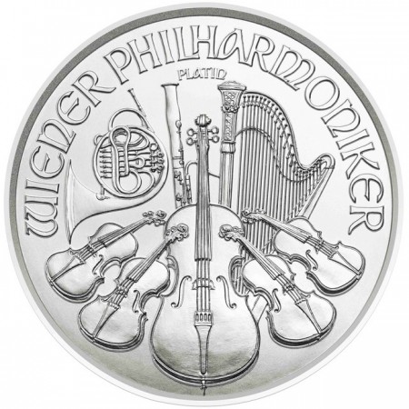 • На реверсе платиновой монеты австрийский Филармоникер изображены различные музыкальные инструменты, такие как контрабас, виолончели, скрипки, фагот, арфа и труба. Сверху надпись – WIENER PHILHARMONIKER