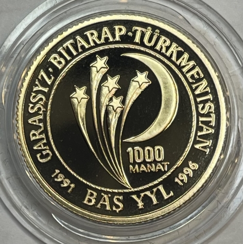 Золотая монета 1000 манат Туркменистан 5 лет Независимости Туркмении, Au 916, общий вес 7,98г.