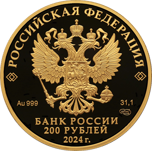 рельефное изображение Государственного герба Российской Федерации, над ним вдоль канта – надпись полукругом «РОССИЙСКАЯ ФЕДЕРАЦИЯ», обрамленная с обеих сторон сдвоенными ромбами, под гербом слева – обозначения драгоценного металла и пробы сплава, справа – содержание химически чистого металла и товарный знак монетного двора, внизу в центре в три строки – надпись «БАНК РОССИИ», номинал монеты «200 РУБЛЕЙ», год выпуска «2024 г.».