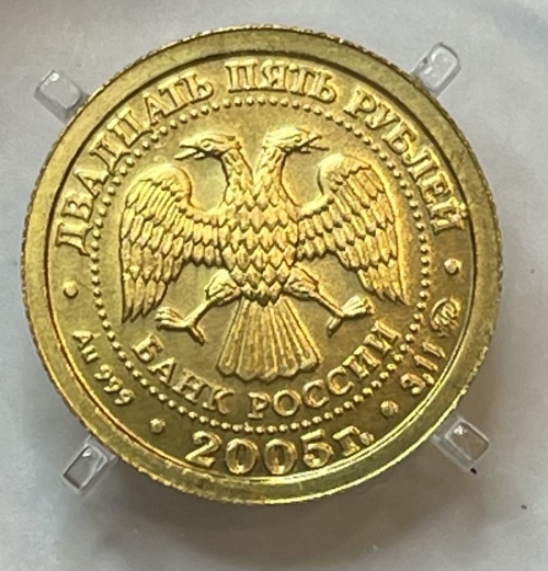 в центре диска – эмблема Банка России (двуглавый орел c опущенными крыльями, под ним надпись полукругом «БАНК РОССИИ»), обрамленная кругом из точек и надписями по кругу: вверху – «ДВАДЦАТЬ ПЯТЬ РУБЛЕЙ», внизу – «2005 г.», слева – обозначение металла, проба сплава, справа – содержание драгоценного металла в чистоте и товарный знак монетного двора.