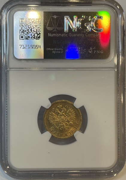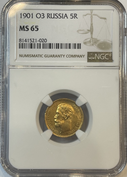 Золотая монета 5 рублей Николай II 1901 г. ФЗ ,в слабе NGC MS 65