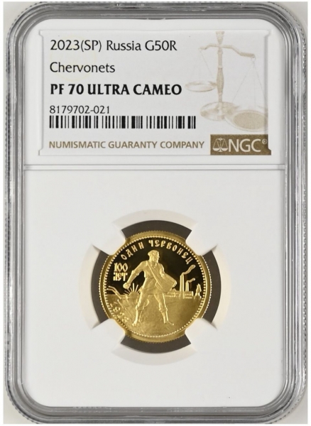 Однако для оборота выпускали не только бумажные деньги. С 1923 года на Петроградском монетном дворе начали выпускать золотые монеты-червонцы, которые по своим параметрам повторяли царские 10 рублей. Их дизайн был разработан медальером Антоном Васютинским на основе эскиза для одной из дореволюционных сельскохозяйственных выставок. На монете в полный рост изображен крестьянин-сеятель на фоне дымящихся труб, плуга и восходящего солнца. Золотых червонцев, датированных 1923 годом, было выпущено чуть более 2,7 млн штук.