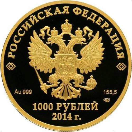 в центре диска - рельефное изображение Государственного герба Российской Федерации (двуглавый орел, поднявший вверх распущенные крылья. Орел увенчан двумя малыми коронами и - над ними - одной большой короной, соединенными лентой. В правой лапе орла - скипетр, в левой - держава. На груди орла, в щите - всадник в плаще на коне, поражающий копьем опрокинутого навзничь и попранного конем дракона), вверху вдоль канта - надпись полукругом: "РОССИЙСКАЯ ФЕДЕРАЦИЯ", обрамленная с обеих сторон орнаментом в виде сдвоенных ромбов, в нижней части диска надписи, слева от гербового орла - обозначающие вид металла и пробу сплава, справа - содержание металла в чистоте и товарный знак монетного двора, внизу у канта - горизонтальная надпись: "1000 РУБЛЕЙ", под ней - дата: "2014 г.".