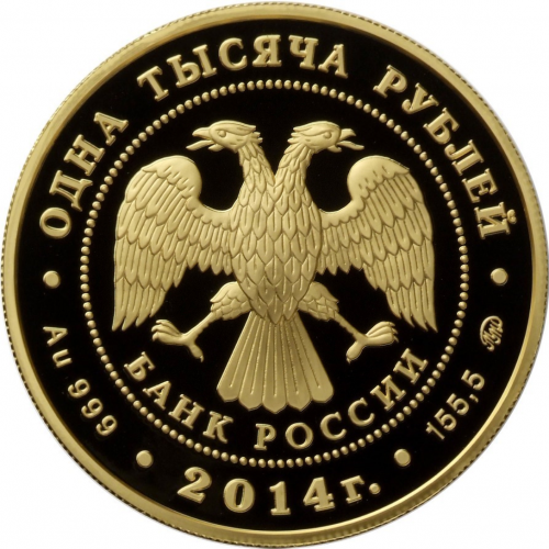 в центре – эмблема Банка России (двуглавый орёл с опущенными крыльями, под ним – надпись полукругом "БАНК РОССИИ"), обрамленная кругом из точек и надписями по кругу – вверху: "ОДНА ТЫСЯЧА РУБЛЕЙ", внизу: слева – обозначения драгоценного металла и пробы сплава, в центре – дата выпуска "2014 г.", справа – содержание химически чистого металла и товарный знак монетного двора.